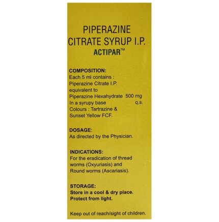 Actipar Syrup is an anti-helminitic medication. It is used in the treatment of worm infections. It works by killing the worms that cause infection. The killed worms are then passed in the stool. Actipar Syrup should be used in the dose and duration as advised by your doctor. It should be taken with food, preferably at a fixed time. Avoid skipping any doses and finish the full course of treatment even if you feel better. Do not take a double dose to make up for a missed dose. Simply take the next dose as planned.Some people may experience nausea, headache, vomiting, and dizziness as the side effects of this medicine. Please consult your doctor if these side effects do not resolve or persist for a longer duration. You may be monitored with blood tests and liver function tests throughout your treatment.