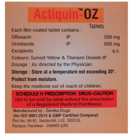 Actiquin-OZ Tablet is a combination of two antibiotics. It is used in the treatment of bacterial and parasitic infections. It effectively treats a wide range of bacterial infections that may occur in the teeth, lungs, gastrointestinal infections, urinary and genital tract. Actiquin-OZ Tablet is best taken with food. Take it at a fixed time to ensure better efficacy. Do not take more than the recommended dose, as it may have harmful effects on your body. If you miss a dose, take it as soon as you remember. The treatment must be completed even if you feel better to ensure a complete recovery.This medicine may lead to some side effects such as nausea, vomiting, stomach pain, loss of appetite, dizziness, and headache. To overcome any such side effects, it is advised to eat a healthy balanced diet and drink plenty of fluid. If any of the side effects get aggravated, consult your doctor immediately. If you experience any allergic reaction (rashes, itching, swelling, shortness of breath, etc.), you must seek immediate medical help.Before taking this medicine, you should tell your doctor if you have any problems with your liver or kidneys. Also, tell your doctor if you are on any medication for any health condition. Pregnant or breastfeeding women should also consult with the doctors before taking it. Avoid drinking alcohol as it can cause excessive dizziness with this medicine. It usually does not impair your ability to drive, but you should not drive if it makes you feel sleepy or dizzy. If you have known allergies to the medicine, refrain from using this medicine. It is advised to take proper rest during the course of treatment for the medicine to work effectively.