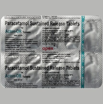Acton-OR Tablet SR is a medicine used in the treatment of pain and fever. It may also be used to treat many conditions such as headache, body ache, period pain, toothache, and cold. It blocks the release of certain chemical messengers that cause pain, inflammation, and fever. You should take Acton-OR Tablet SR regularly as advised by your doctor. It is usually best taken with food otherwise it may upset your stomach. Do not take more or use it for longer than recommended.Side effects are rare if this medicine is used correctly but this medicine may cause stomach pain, nausea, and vomiting in some people. Consult your doctor if any of these side effects bother you or do not go away.Before taking it, let your doctor know if you have liver or kidney problems or are using blood-thinning medicines. It may affect the dose or suitability of this medicine. Let your doctor know about all the other medicines you are taking because they may affect, or be affected by, this medicine. Pregnant or breastfeeding women should consult their doctor before taking this medicine. It is best to avoid drinking alcohol while using this medicine.