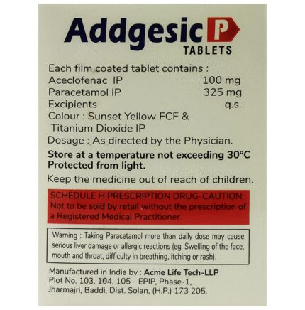 Addgesic P Tablet is a pain-relieving medicine. It is used to reduce pain and inflammation in conditions like rheumatoid arthritis, ankylosing spondylitis, and osteoarthritis. It may also be used to relieve muscle pain, back pain, toothache, or pain in the ear and throat. Addgesic P Tablet should be taken with or without food. You should take it regularly as advised by your doctor. Your doctor may change the dose and time between doses according to your pain level and your needs. Do not take more or use it for a longer duration than recommended by your doctor.Some of the common side effects of this medicine include nausea, vomiting, stomach pain, heartburn, and diarrhea. If any of these side effects bother you or do not go away with time, you should let your doctor know. Your doctor may help you with ways to reduce or prevent these side effects by prescribing an alternative medicine or adjusting the dose.Addgesic P Tablet may not be suitable for everybody. Before taking it, let your doctor know if you have any problems with your heart, kidneys, liver, or have stomach ulcers. To make sure it is safe for you, let your doctor know about all the other medicines you are taking. Pregnant and breastfeeding mothers should first consult their doctors before using Addgesic P Tablet.