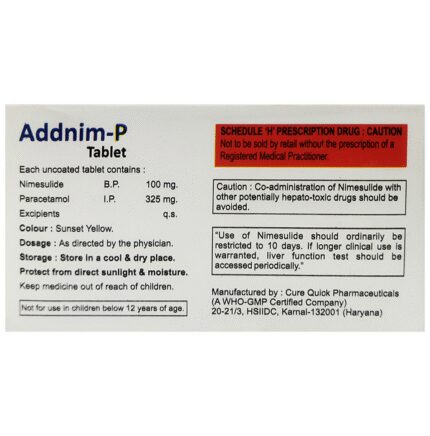 Addnim-P Tablet is a combination medicine that helps in relieving pain. It is used to relieve pain and inflammation in conditions like rheumatoid arthritis, ankylosing spondylitis, and osteoarthritis. It is also used to relieve fever, muscle pain, back pain, toothache, or pain in the ear and throat. Addnim-P Tablet should be taken with food. This will prevent you from getting an upset stomach. The dose will depend on what you are taking it for and how well it helps your symptoms. You should take it as advised by your doctor. Do not take more or use it for a longer duration than recommended by the doctor.The most common side effects of this medicine include nausea, vomiting, diarrhea, and increased liver enzymes. If any of these side effects bother you or get worse, you should speak to your doctor. Your doctor may be able to suggest ways of preventing or reducing the side effects.Before taking it, you should let your doctor know if you have a history of ulcer or bleeding in your stomach, high blood pressure, or have any trouble with your heart, kidneys, or liver. Let your doctor also know about all the other medicines you are taking because they may affect, or be affected by, this medicine.Pregnant or breastfeeding women should consult their doctor before starting treatment. You should also avoid drinking alcohol while you are taking this medicine, as alcohol can cause excessive drowsiness.Note: As per the Ministry of Health and Family Welfare, Addnim-P Tablet is banned for children under 12 years of age.