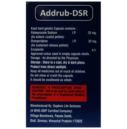 Addrub-DSR Capsule is a combination medicine used to treat gastroesophageal reflux disease (Acid reflux). It works by relieving the symptoms of acidity such as heartburn, stomach pain, or irritation. It also neutralizes the acid and promotes easy passage of gas to reduce stomach discomfort. Addrub-DSR Capsule is taken without food in a dose and duration as advised by the doctor. The dose you are given will depend on your condition and how you respond to the medicine. You should keep taking this medicine for as long as your doctor recommends. If you stop treatment too early your symptoms may come back and your condition may worsen. Let your healthcare team know about all other medications you are taking as some may affect, or be affected by this medicine.The most common side effects are diarrhea, stomach pain, dryness in the mouth, headache, flatulence, and weakness. Most of these are temporary and usually resolve with time. Contact your doctor straight away if you are at all concerned about any of these side effects. This medicine may cause dizziness and sleepiness, so do not drive or do anything that requires mental focus until you know how this medicine affects you. Avoid drinking alcohol while taking this medicine as it can worsen your sleepiness. Lifestyle modifications like having cold milk and avoiding hot tea, coffee, spicy food or chocolate can help you to get better results.Before you start taking this medicine it is important to inform your doctor if you are suffering from kidney or liver disease. You should also tell your doctor if you are pregnant, planning pregnancy or breastfeeding.