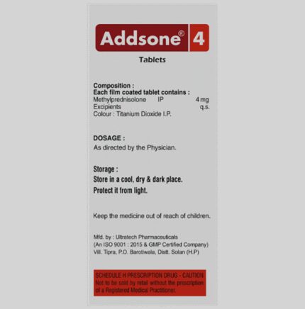 Addsone 4 Tablet is a medicine used to treat a wide variety of medical conditions such as severe allergic conditions, asthma, rheumatic disorder, skin and eye disorders, and systemic lupus erythematosus. It provides relief by preventing the release of substances that cause inflammation. Addsone 4 Tablet should be taken with food. This will prevent you from getting an upset stomach. The dose and duration will depend on what you are being treated for. You should always take the amount prescribed. Do not take a larger dose or use it more often. Keep taking it regularly even if you feel well. Some conditions will become worse if you stop using this medicine.The most common side effects of this medicine include skin thinning, increased risk of infection, reduction in bone density, and mood changes. If these side effects bother you or do not go away, your doctor may suggest ways of preventing or reducing them. The use of this medicine may lower your ability to fight infections so avoid being near people who might pass on infections such as measles, chickenpox, or flu.Before using this medicine, you should tell your doctor if you have brittle bones (osteoporosis), mood disorders, high blood pressure, or liver disease. Also, tell your doctor if you have diabetes, this medicine may increase blood glucose levels which can cause or worsen diabetes. Many other drugs may affect, or be affected by, this medicine so let your doctor know all other medicines you are using, to make sure it is safe. You should also tell your doctor if you are pregnant, planning pregnancy or breastfeeding.