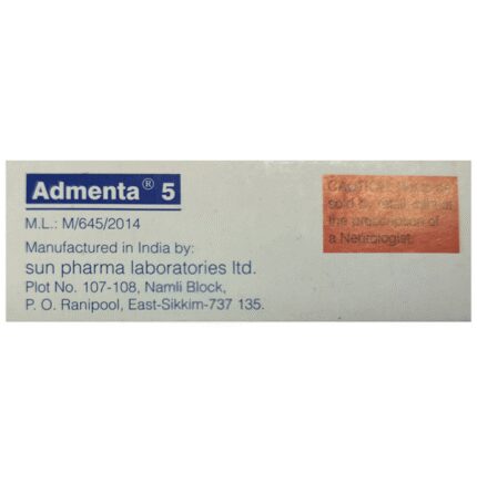 Admenta 5 Tablet is a medicine used in the treatment of Alzheimer's disease. It helps to slow down the progression of moderate to severe Alzheimer's disease by improving memory and thinking. This medicine works by blocking a chemical messenger involved in the transmission of nerve signals. Admenta 5 Tablet maybe taken with or without food. However, it is advised to take it at the same time each day to maintain a consistent level of medicine in the blood. If you missed a dose, take it as soon as you remember. Do not skip any doses and finish the full course of treatment even if you feel better. It is important that this medication is not stopped suddenly without talking to your doctor.The most common side effects of this medicine are dizziness, headache, confusion, and constipation. It may also cause dizziness and sleepiness, so do not drive or do anything that requires mental focus until you know how this medicine affects you.Before taking this medicine, inform the doctor if you have a history of seizures, kidney disease, heart disease, or liver disease. Let your doctor also know if you are taking any other medicines for any medical conditions. Pregnant and breastfeeding women should consult their doctors before taking this medicine.