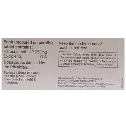 Admol 250 DT Tablet is a widely prescribed medicine that helps to ease pain and bring down high body temperature (fever). In children, it treats conditions like headache, toothache, body ache, fever, and common cold. Admol 250 DT Tablet is given orally preferably at a fixed time every day. Though this medicine can be taken before or after food, it is best given after food as it can irritate the inner lining of an empty stomach. The dose and duration will depend upon your child’s age, body weight, and severity of the infection, so stick to the dose, time, and way prescribed by your child’s doctor. If your child vomits within 30 minutes of taking the medicine, let the child calm down and repeat the same dose. Redosing is not recommended if your child gets sick more than 30 minutes after taking a dose.Do not give your child Admol 250 DT Tablet along with other medicines (many cold and flu medicines and other painkillers) that contain paracetamol, as this may result in overdosing and cause dangerous side effects such as hepatotoxicity (liver damage). Always check the ingredients of any other medicines before giving them to your child in combination with this medicine.Generally, this medicine is well-tolerated by the children. However, temporary side effects such as indigestion, nausea, vomiting, and difficulty in sleeping, may occur in some children. Consult your doctor in case these episodes become bothersome for your child.This medicine is often considered safe and effective but may not be suitable for everybody. Inform your doctor if your child is undergoing treatment for any blood-related disorder, is allergic to any medicinal compound, or has any birth defects, liver impairment, or kidney dysfunction. This will help your child’s doctor evaluate the dose and suitability of this medicine in a better way.