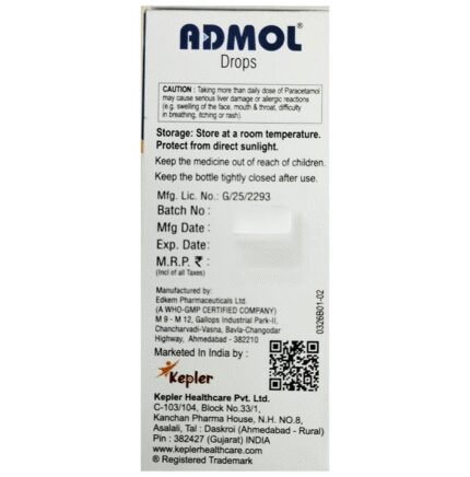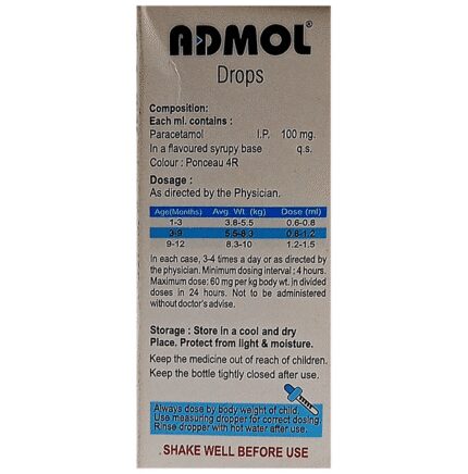 Admol Drop is a widely prescribed medicine that helps to ease pain and bring down high body temperature (fever). In children, it treats conditions like headache, toothache, body ache, fever, and common cold. Admol Drop is given orally preferably at a fixed time every day. Though this medicine can be taken before or after food, it is best given after food as it can irritate the inner lining of an empty stomach. The dose and duration will depend upon your child’s age, body weight, and severity of the infection, so stick to the dose, time, and way prescribed by your child’s doctor. If your child vomits within 30 minutes of taking the medicine, let the child calm down and repeat the same dose. Redosing is not recommended if your child vomits more than 30 minutes after taking a dose.Do not give your child Admol Drop along with other medicines (many cold and flu medicines and other painkillers) that contain paracetamol, as this may result in overdosing and cause dangerous side effects such as hepatotoxicity (liver damage). Always check the ingredients of any other medicines before giving them to your child in combination with this medicine.Generally, this medicine is well-tolerated by the children. However, temporary side effects such as indigestion, nausea, and vomiting may occur in some children. Consult your doctor in case these episodes become bothersome for your child.This medicine is often considered safe and effective but may not be suitable for everybody. Inform your doctor if your child is undergoing treatment for any blood-related disorder, is allergic to any medicinal compound, or has any birth defects, liver impairment, or kidney dysfunction. This will help your child’s doctor evaluate the dose and suitability of this medicine in a better way.
