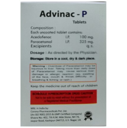 Advinac-P Tablet is a pain-relieving medicine. It is used to reduce pain and inflammation in conditions like rheumatoid arthritis, ankylosing spondylitis, and osteoarthritis. It may also be used to relieve muscle pain, back pain, toothache, or pain in the ear and throat. Advinac-P Tablet should be taken with or without food. You should take it regularly as advised by your doctor. Your doctor may change the dose and time between doses according to your pain level and your needs. Do not take more or use it for a longer duration than recommended by your doctor.Some of the common side effects of this medicine include nausea, vomiting, stomach pain, heartburn, and diarrhea. If any of these side effects bother you or do not go away with time, you should let your doctor know. Your doctor may help you with ways to reduce or prevent these side effects by prescribing an alternative medicine or adjusting the dose.Advinac-P Tablet may not be suitable for everybody. Before taking it, let your doctor know if you have any problems with your heart, kidneys, liver, or have stomach ulcers. To make sure it is safe for you, let your doctor know about all the other medicines you are taking. Pregnant and breastfeeding mothers should first consult their doctors before using Advinac-P Tablet.