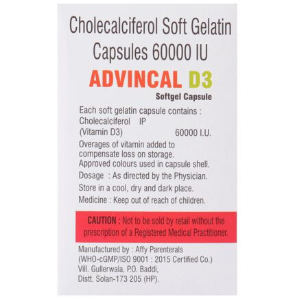 Advincal D3 Softgel Capsule is used to treat vitamin D deficiency and osteoporosis. It helps the body absorb calcium, which is essential for maintaining strong and healthy bones. It is used when the diet does not provide enough. Advincal D3 Softgel Capsule should be taken as directed by your doctor. It is best taken with or after food as this helps your body absorb it, and you should take it regularly to get the most benefit. If you are using it to treat osteoporosis, you will also be prescribed other medicines. This medicine may be only part of a complete treatment program that includes making changes to your diet and taking calcium and vitamin supplements. Learn about the foods you should eat to ensure you get enough calcium and vitamin D.Advincal D3 Softgel Capsule has few side effects, and none are common. If you take too much, you may feel weakness, muscle pain, or a metallic taste in your mouth. If you experience any such side effects, speak with your doctor. They may be able to help you reduce or treat the symptoms.Before taking this medicine, tell your doctor if you have high calcium levels in your blood or if you have any heart, kidney, or liver disease. Some other medicines can decrease the absorption of vitamin D3, so let your doctor know all other medicines you are taking to make sure you are safe. This medicine may help during pregnancy when your body needs more vitamin D, but too much could harm your baby. Discuss with your doctor.