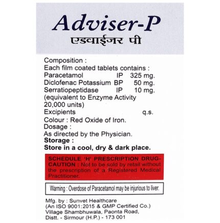 Adviser-P Tablet is a pain-relieving medicine. It helps in relieving moderate pain and reducing fever. It is used in various conditions such as muscle ache, back pain, joint pain, menstrual cramps, and toothache. Adviser-P Tablet should be taken with food. This will prevent you from getting an upset stomach. The dose and duration will depend on what you are taking it for and how well it helps your symptoms. You should keep taking the medicine even if you feel better until the doctor says it is alright to stop using it.Using this medicine may cause few common side effects such as nausea, vomiting, headache, vertigo, stomach pain, indigestion, and heartburn. If you experience any such side effects that do not go away or get worse, you should let your doctor know. Your doctor may be able to suggest ways of preventing or reducing the symptoms. In general, you should try to use the smallest amount necessary to control your symptoms.Before using the medicine, you should tell your doctor if you have any other medical conditions or disorders. It may also affect, or be affected by, some other medicines you are using so let your doctor know all the other medicines you are taking. It should be used with caution in patients who are alcoholic or have liver or kidney disease. Pregnant and breastfeeding women should consult their doctors first before using the medicine.