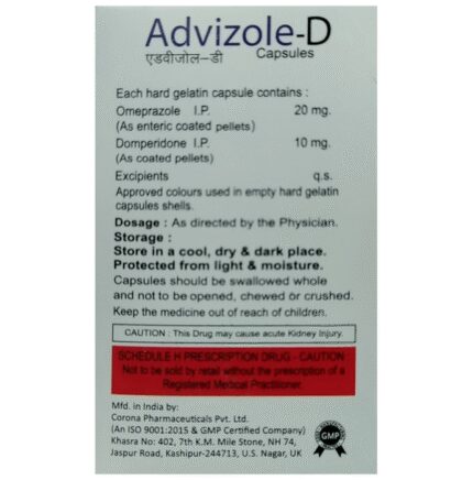 Advizole D Capsule is a prescription medicine used to treat gastroesophageal reflux disease (Acid reflux) by relieving the symptoms such as heartburn, stomach pain, or irritation. It also neutralizes the acid in the stomach and promotes easy passage of gas to reduce stomach discomfort. Advizole D Capsule is taken without food in a dose and duration as advised by the doctor. The dose you are given will depend on your condition and how you respond to the medicine. You should keep taking this medicine for as long as your doctor recommends. If you stop treatment too early your symptoms may come back and your condition may worsen. Let your healthcare team know about all other medications you are taking as some may affect, or be affected by this medicine.Most common side effects are diarrhea, stomach pain, dryness in mouth, headache, and flatulence. Most of these are temporary and usually resolve with time. Contact your doctor straight away if you are at all concerned about any side effects. It may also cause dizziness, so do not drive or do anything that requires mental focus until you know how this medicine affects you. Avoid drinking alcohol while taking this medicine as it can worsen your dizziness. Lifestyle modifications like having cold milk and avoiding hot tea, coffee, spicy food or chocolate can help you to get better results.Before taking this medicine, you should tell your doctor if you are pregnant, planning pregnancy or breastfeeding. You should also tell your doctor if you have liver diseases so that your doctor can prescribe a suitable dose for you.