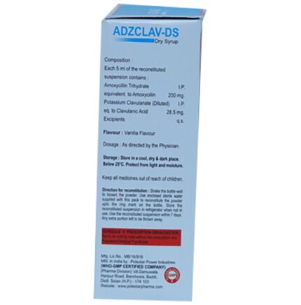 Adzclav-DS Dry Syrup is an antibiotic medicine that helps treat bacterial infections of the ear, nose, throat, chest, lungs, teeth, skin, and urinary tract. It is capable of killing bacteria that have become resistant to other therapies and thus also helps treat tuberculosis that is resistant to other treatments. You can give Adzclav-DS Dry Syrup to your child with or without food. It is better to give it with food as that helps increase absorption and decrease the risk of stomach upset. The doctor may prescribe giving it two to three times a day. Medicine dose depends on the severity of the infection, its type, and your child’s body weight and age. So, stick to the dose, time, and way prescribed. If your child vomits the medicine within 30 minutes of intake, let the child calm down and repeat the dose. Do not double dose if it's the time for the next dose.Adzclav-DS Dry Syrup may cause vomiting, diarrhea, nausea, abdominal pain, and allergy. These side effects should diminish on their own. But, in case they persist or start bothering your child, you must not delay speaking to your child’s doctor.Share your child’s entire medical history with the doctor, including any previous episode of allergy, heart problem, a blood disorder, birth defects, airway obstruction, lung anomaly, gastrointestinal problem, skin disorder, liver impairment, and kidney malfunction. This information will assist the doctor in making dose alterations and in planning your child’s overall treatment.