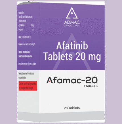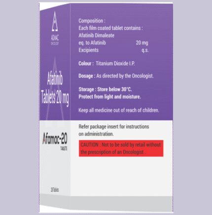 Afamac 20 Tablet is used in the treatment of non-small cell lung cancer. It is used in the treatment of adult patients who have certain mutations of epidermal growth factor receptor (EGFR). Afamac 20 Tablet should be taken on an empty stomach, but try to have it at the same time every day to get the most benefits. Your doctor will decide what dose is necessary and how often you need to take it. This will depend on what you are being treated for and may change from time to time. You should take it exactly as your doctor has advised. Taking it in the wrong way or taking too much can cause very serious side effects. It may take several weeks or months for you to see or feel the benefits but do not stop taking it unless your doctor tells you to.The most common side effects of this medicine include diarrhea, rash, dry skin, and nausea. Diarrhea can be serious sometimes so take medicine to treat it as prescribed by the doctor or stay hydrated. Your doctor may advise for some blood tests while you are taking this medicine. It may also make your skin sensitive to the sun, so use sunscreen and wear protective clothing if you have to be in sunlight. Inform your doctor if you notice pain or redness in the eye or dry eye.Before taking it, tell your doctor if have a breathing problem, liver, or kidney problems, or are taking any medicines to treat infections. Many other medicines can affect, or be affected by, this medicine so let your healthcare team know all medications you are using. This medicine is not recommended during pregnancy or while breastfeeding. The use of effective contraception by females during treatment is important to avoid pregnancy.