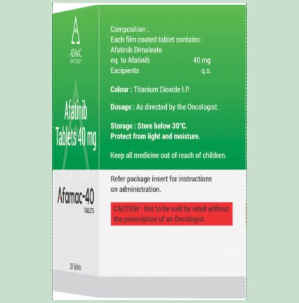 Afamac 40 Tablet is used in the treatment of non-small cell lung cancer. It is used in the treatment of adult patients who have certain mutations of epidermal growth factor receptor (EGFR). Afamac 40 Tablet should be taken on an empty stomach, but try to have it at the same time every day to get the most benefits. Your doctor will decide what dose is necessary and how often you need to take it. This will depend on what you are being treated for and may change from time to time. You should take it exactly as your doctor has advised. Taking it in the wrong way or taking too much can cause very serious side effects. It may take several weeks or months for you to see or feel the benefits but do not stop taking it unless your doctor tells you to.The most common side effects of this medicine include diarrhea, rash, dry skin, and nausea. Diarrhea can be serious sometimes so take medicine to treat it as prescribed by the doctor or stay hydrated. Your doctor may advise for some blood tests while you are taking this medicine. It may also make your skin sensitive to the sun, so use sunscreen and wear protective clothing if you have to be in sunlight. Inform your doctor if you notice pain or redness in the eye or dry eye.Before taking it, tell your doctor if have a breathing problem, liver, or kidney problems, or are taking any medicines to treat infections. Many other medicines can affect, or be affected by, this medicine so let your healthcare team know all medications you are using. This medicine is not recommended during pregnancy or while breastfeeding. The use of effective contraception by females during treatment is important to avoid pregnancy.