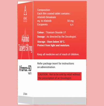 Afamac 50 Tablet is used in the treatment of non-small cell lung cancer. It is used in the treatment of adult patients who have certain mutations of epidermal growth factor receptor (EGFR). Afamac 50 Tablet should be taken on an empty stomach, but try to have it at the same time every day to get the most benefits. Your doctor will decide what dose is necessary and how often you need to take it. This will depend on what you are being treated for and may change from time to time. You should take it exactly as your doctor has advised. Taking it in the wrong way or taking too much can cause very serious side effects. It may take several weeks or months for you to see or feel the benefits but do not stop taking it unless your doctor tells you to.The most common side effects of this medicine include diarrhea, rash, dry skin, and nausea. Diarrhea can be serious sometimes so take medicine to treat it as prescribed by the doctor or stay hydrated. Your doctor may advise for some blood tests while you are taking this medicine. It may also make your skin sensitive to the sun, so use sunscreen and wear protective clothing if you have to be in sunlight. Inform your doctor if you notice pain or redness in the eye or dry eye.Before taking it, tell your doctor if have a breathing problem, liver, or kidney problems, or are taking any medicines to treat infections. Many other medicines can affect, or be affected by, this medicine so let your healthcare team know all medications you are using. This medicine is not recommended during pregnancy or while breastfeeding. The use of effective contraception by females during treatment is important to avoid pregnancy.