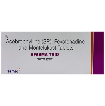 Afasma Trio Tablet SR is a combination medicine used in the prevention of asthma. It relieves allergy symptoms such as runny nose, stuffy nose, sneezing, watery eyes and congestion or stuffiness. It also helps in relaxing the muscles of the air passages, thus widening it and making it easier to breathe. Afasma Trio Tablet SR is taken with or without food in a dose and duration as advised by the doctor. The dose you are given will depend on your condition and how you respond to the medicine. You should keep taking this medicine for as long as your doctor recommends. If you stop treatment too early your symptoms may come back and your condition may worsen. Let your healthcare team know about all other medications you are taking as some may affect, or be affected by this medicine.The most common side effects are nausea, vomiting, stomach pain, diarrhea, skin rash, itching, breathing difficulty, and headache. Most of these are temporary and usually resolve with time. Contact your doctor straight away if you are at all concerned about any of these side effects. This medicine may cause dizziness and sleepiness, so do not drive or do anything that requires mental focus until you know how this medicine affects you. Avoid drinking alcohol while taking this medicine as it can worsen your sleepiness.Before taking it, you should tell your doctor if you have any kidney or liver diseases so that your doctor can prescribe a suitable dose for you. You should also tell your doctor if you are pregnant, planning pregnancy or breastfeeding.