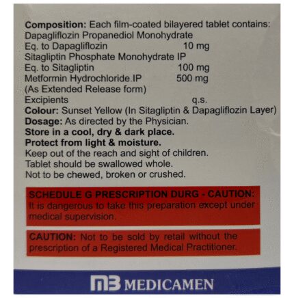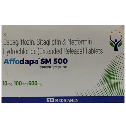 Affodapa SM 500 Tablet ER is a combination medicine that helps control blood sugar levels. This medicine is used together with diet and exercise to improve blood sugar control in adults with type 2 diabetes mellitus. It helps in proper utilization of insulin, thereby lowering the blood sugar level. Affodapa SM 500 Tablet ER can be taken with or without food at any time of the day but try to take it at the same time every day. The dose will be decided by your doctor, so don’t stop taking it without asking them. If you do, your blood sugar levels may increase your risk of serious complications like kidney damage and blindness. This medicine is only a part of the treatment program that should include a healthy diet, regular exercise, and weight reduction as advised by your doctor.The most common side effects of this medicine include urinary tract infection, nasal congestion, sore throat, and upper respiratory tract infection. Drinking plenty of fluids while using it will help prevent dehydration. Some people may develop fungal infections in the genital area. Maintaining good hygiene can help prevent this.Before taking Affodapa SM 500 Tablet ER, inform your doctor if you have any kidney or liver problems, a urinary tract infection, or you are on water pills (diuretics). Pregnant or breastfeeding women should also consult their doctor before taking it. Avoid excessive alcohol intake while taking this medicine, as this may increase the risk of some side effects. Monitor your blood sugar levels regularly while taking this medicine.