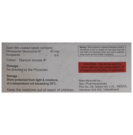 Affolmy 40 Tablet is a medicine used in the treatment of hypertension (high blood pressure). Lowering blood pressure helps to prevent future heart attacks and stroke. This medicine is also effective in preserving kidney function in patients with diabetes. Affolmy 40 Tablet may be prescribed either alone or in combination with other medicines. It may be taken with or without food during the day or at night. However, try to take it at about the same time each day to get the maximum benefit. It is important to continue taking it regularly even if you feel well or if your blood pressure is controlled. Most people with high blood pressure do not feel ill, but if you stop taking this medicine, your condition could get worse.Making some changes in your lifestyle will also help lower your blood pressure. These may include regular exercise, losing weight, smoking cessation, reducing alcohol intake, and reducing the amount of salt in your diet as advised by your doctor. This medicine is tolerated well by most patients and has few side effects. However, some may experience side effects like dizziness, cough, diarrhea, indigestion, nausea, and runny nose, particularly after the first dose. Let your doctor know if this bothers you or does not go away.Before taking this medicine, let your doctor know if you have any kidney or liver problems. Pregnant or breastfeeding mothers should not take this medicine. Your doctor may check your kidney function, blood pressure, and potassium levels in your blood at regular intervals while you are taking this medicine.
