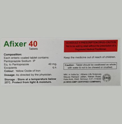 Afixer 40 Tablet is a medicine that reduces the amount of acid produced in your stomach. It is used for treating acid-related diseases of the stomach and intestine such as heartburn, acid reflux, peptic ulcer disease, and Zollinger-Ellison syndrome. It provides relief from the symptoms and promotes healing. Afixer 40 Tablet is also used to prevent stomach ulcers and acidity that may be seen with the prolonged use of painkillers. It belongs to a class of medicines known as proton pump inhibitors (PPIs). This medicine should be taken one hour before a meal, preferably in the morning. The dose will depend on your underlying condition and how you respond to the medicine. You should keep on taking it as prescribed even if your symptoms disappear quickly. You can increase the efficiency of the treatment by eating smaller meals more often and avoiding caffeinated drinks (like tea and coffee), and spicy or fatty foods.The most common side effects observed with this medicine include nausea, vomiting, headache, dizziness, flatulence, diarrhea, and stomach pain. These symptoms are generally mild but if they bother you or do not go away, consult your doctor. Long-term use of this medicine may lead to an increased risk of side effects. For instance, using this medicine for more than 1 year may increase your risk for bone fractures, especially with higher doses. Talk to your doctor about ways to prevent bone loss (osteoporosis), like taking calcium and vitamin D supplements.Before taking this medicine, you need to tell your doctor if you have severe liver problems, are taking medicines for HIV, have ever had an allergic reaction to similar medicines in the past, or suffer from bone loss (osteoporosis). Pregnant or breastfeeding women should also consult their doctor before taking it.