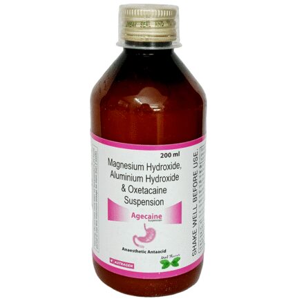 Agecaine Oral Suspension Mint is a combination medicine used in the treatment of acidity, stomach ulcer and heartburn. It helps in relieving the symptoms of acidity and ulcers such as stomach pain or irritation. It also neutralizes excessive acid in the stomach and helps in easy passage of gas. Agecaine Oral Suspension Mint is taken without food in a dose and duration as advised by the doctor. The dose you are given will depend on your condition and how you respond to the medicine. You should keep taking this medicine for as long as your doctor recommends. If you stop treatment too early your symptoms may come back and your condition may worsen. Let your healthcare team know about all other medications you are taking as some may affect, or be affected by this medicine. Do not take it for more than the recommended duration as long-term administration may have harmful effects on the health.The most common side effects are diarrhea, constipation, and allergic reaction. These are temporary and usually resolve with time. Contact your doctor straight away if you are at all concerned about any side effects. To overcome constipation, you should add fiber-rich foods in your diet and stay hydrated. Lifestyle modifications like having cold milk and avoiding hot tea, coffee, spicy food or chocolate can help you to get better results.Before taking this medicine, you should tell your doctor if you are pregnant, planning pregnancy or breastfeeding. You should also tell your doctor if you have any liver diseases so that your doctor can prescribe a suitable dose for you.