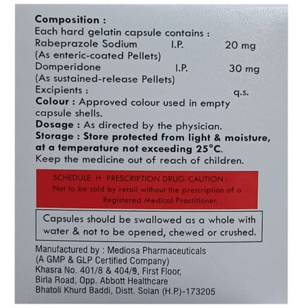 Agerab-DSR Capsule is a combination medicine used to treat gastroesophageal reflux disease (Acid reflux). It works by relieving the symptoms of acidity such as heartburn, stomach pain, or irritation. It also neutralizes the acid and promotes easy passage of gas to reduce stomach discomfort. Agerab-DSR Capsule is taken without food in a dose and duration as advised by the doctor. The dose you are given will depend on your condition and how you respond to the medicine. You should keep taking this medicine for as long as your doctor recommends. If you stop treatment too early your symptoms may come back and your condition may worsen. Let your healthcare team know about all other medications you are taking as some may affect, or be affected by this medicine.The most common side effects are diarrhea, stomach pain, dryness in the mouth, headache, flatulence, and weakness. Most of these are temporary and usually resolve with time. Contact your doctor straight away if you are at all concerned about any of these side effects. This medicine may cause dizziness and sleepiness, so do not drive or do anything that requires mental focus until you know how this medicine affects you. Avoid drinking alcohol while taking this medicine as it can worsen your sleepiness. Lifestyle modifications like having cold milk and avoiding hot tea, coffee, spicy food or chocolate can help you to get better results.Before you start taking this medicine it is important to inform your doctor if you are suffering from kidney or liver disease. You should also tell your doctor if you are pregnant, planning pregnancy or breastfeeding.