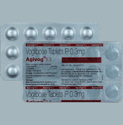 Agivog 0.3 Tablet is a medicine used to treat type 2 diabetes mellitus. It helps control the high blood sugar levels in your body after each meal. It is used when other similar medicines along with a restricted diet, are unable to control abnormally high blood sugar levels.Agivog 0.3 Tablet should be taken just before a meal. The dose and how often you need it will be decided by your doctor so that you get the right amount to control your blood sugar levels. Do not stop taking it suddenly without consulting your doctor. If you do, your blood sugar levels may increase and put you at risk of serious complications like kidney damage and blindness.This medicine is only part of a treatment program that should also include a healthy diet, regular exercise, and weight reduction as advised by your doctor. Monitor your blood sugar levels regularly while taking this medicine.The most common side effects of Agivog 0.3 Tablet include flatulence (gas), stomach pain, loss of appetite, constipation, and diarrhea. Consult your doctor if any of these side effects bother you or do not go away. This medicine by itself does not cause hypoglycemia (low blood sugar levels). However, when used in combination with other diabetes medicines (especially insulin or sulphonylureas), it can lead to hypoglycemia (low blood sugar levels). Such episodes of hypoglycemia will have to be treated by taking plain glucose. Table sugar or common sugar will not help correct low blood sugar levels if you are taking this medicine.Before taking it, let your doctor know if you have any kidney or liver problems. Do not take this medicine if you have ulceration or inflammation in the bowel (eg. ulcerative colitis or Crohn’s disease). Pregnant or breastfeeding women should also consult their doctor before taking it. Please tell your doctor about all the other medicines you are taking to make sure you are safe. Avoid excessive alcohol intake while taking this medicine as it may increase the risk of hypoglycemia (low blood sugar levels).