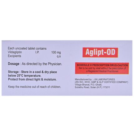 Aglipt-OD Tablet is a medicine used to treat type 2 diabetes mellitus. It is used together with a healthy diet and regular exercise to control blood sugar levels. This helps to prevent serious complications of diabetes like kidney damage and blindness. Aglipt-OD Tablet is normally prescribed when diet and exercise alone or other medicines do not prove sufficient to control your blood sugar level. Your doctor may prescribe it alone or along with other diabetes medicines. It may be taken on an empty stomach or with a meal. The dose will depend on your condition, and blood sugar levels. Therefore, you should use it as advised by your doctor.You should take it regularly at the same time each day to get the most benefit, and you should not stop unless your doctor recommends it. This medicine is helping you to control your blood sugar levels and prevent serious complications in the future. It is important to stay on the diet and exercise program recommended by your doctor while taking this medicine. Your lifestyle plays a big part in controlling diabetes.The most common side effect of taking this medicine is a headache. This is usually minor and improves with time. Low blood sugar level (hypoglycemia) is a possible side effect if you are also taking other diabetes medicines like insulin or sulfonylurea, so you need to know how to recognize and deal with it. It may also cause upper respiratory tract infections like sore throat, cough, and cold. Contact your doctor if the side effects worry you or if they do not go away.Before taking this medicine, let your doctor know if you have ever had kidney disease, heart or pancreas problems, or if you drink a lot of alcohol. Pregnant or breastfeeding women should also consult their doctor before taking it. Some other medicines you are taking may interfere with this medicine's working. So, make sure your doctor knows about all the other medicines you are using. Limit your alcohol intake while taking this medicine because it can increase your risk of developing low blood sugar levels. You may need regular tests such as kidney function and blood glucose levels to check that the medicine is working properly.