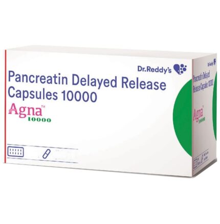 Agna 10000 Capsule DR is used to treat pancreatic enzyme deficiency. It is a pancreatic enzyme supplement that helps in digestion. This medicine also reduces stool frequency and stomach discomfort. Agna 10000 Capsule DR should be taken during or immediately after eating a meal or a snack with plenty of water. This helps the enzymes mix with the food so they can help digest it. The dose you’re given will depend on your condition and how you respond to the medicine. You should take this medicine until your doctor tells you to stop. You may be taking it for the rest of your life, so get into a routine and make sure you take it regularly. Agna 10000 Capsule DR may only be a part of your treatment which could include a special diet.The most common side effects of this medicine include stomach pain, abdominal bloating, and diarrhea. If these bother you or won’t go away, let your doctor know. There may be ways of preventing or reducing these effects.You should let your doctor know if you have gout, asthma, or any allergies. If you have diabetes, this medicine may affect your blood sugar levels and therefore your diabetes treatment. You shouldn’t take it at the same time as an antacid. Talk to your doctor if you’re pregnant or breastfeeding to make sure it’s safe for you. While you’re taking it, your doctor may carry out regular blood tests to make sure it’s helping you.